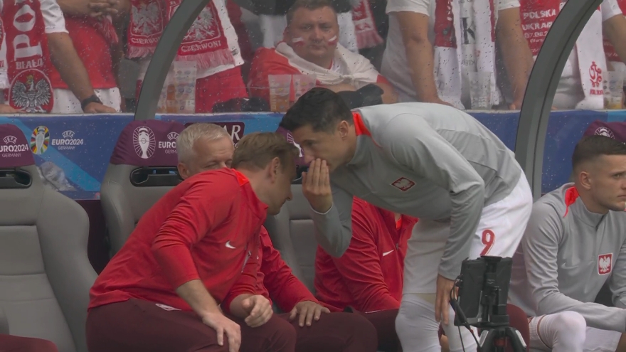 在说啥呢?波兰落后且场面被动,替补席莱万起身和教练组窃窃私语