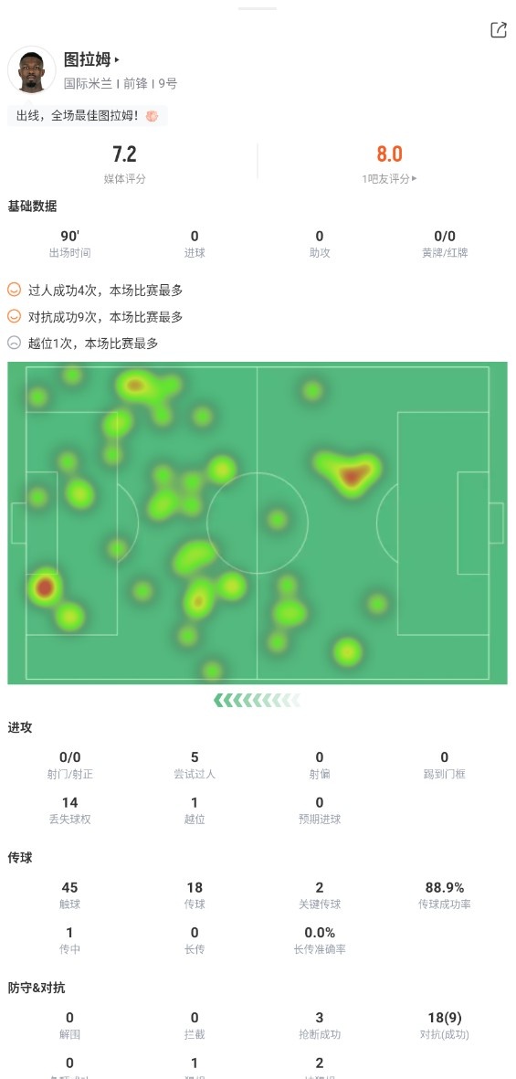 小图拉姆全场数据:4次过人成功,0次射门,获评7.2分