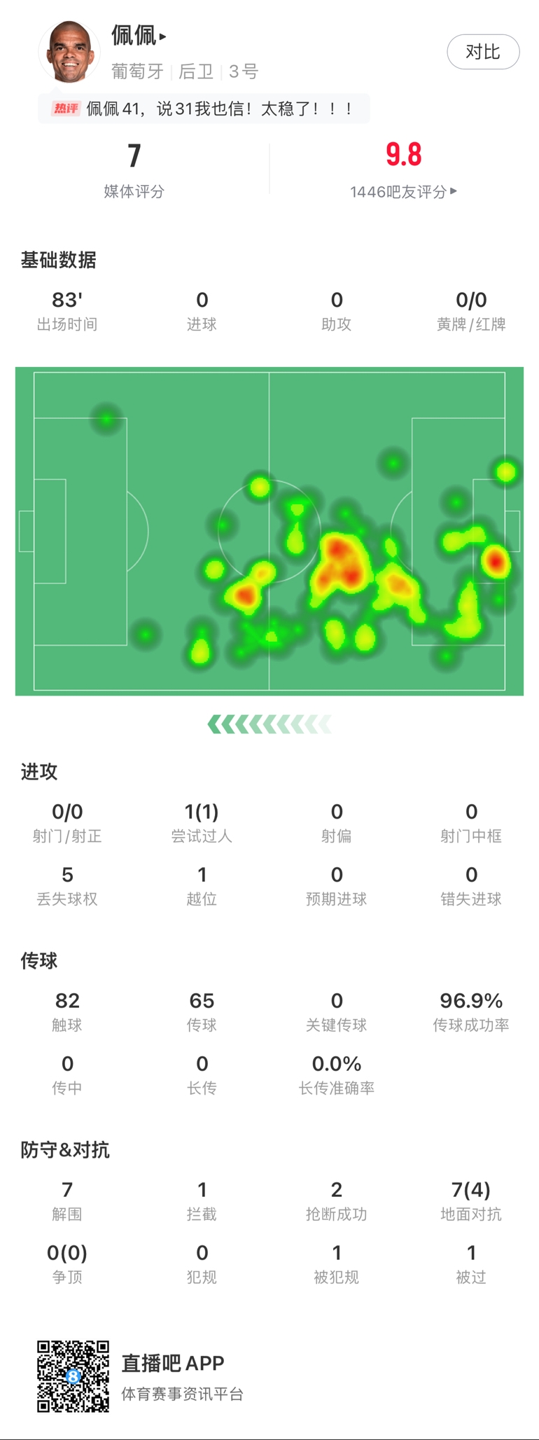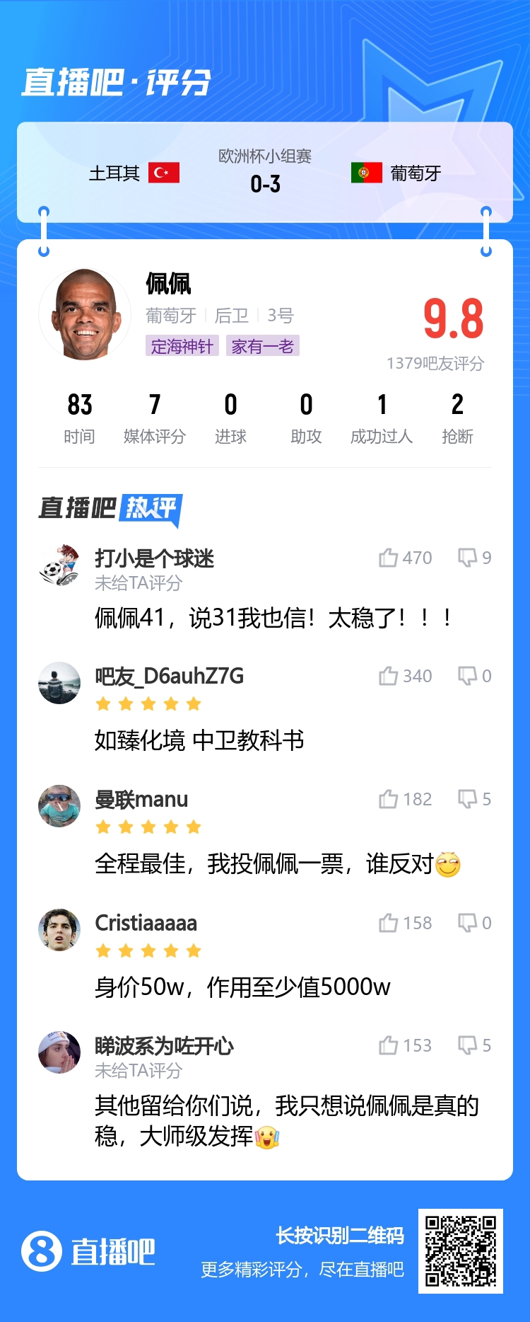 06月23日讯 欧洲杯F组第2轮,葡萄牙3-0完胜土耳其,锁定小组头名出线。41岁的葡萄牙中卫佩佩本场首发出战83分钟被换下,吧友为他出9.8的超高分。【吧友来为本场