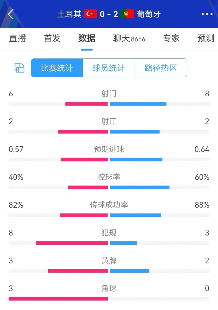 葡萄牙vs土耳其半场数据:射门8-6、射正2-2、预期进球0.64-0.57