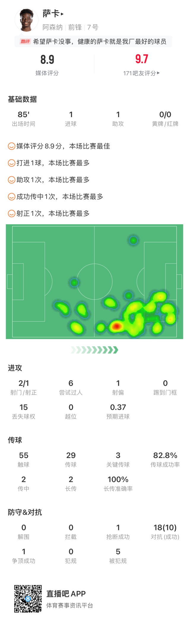 本场比赛萨卡具体数据如下:
