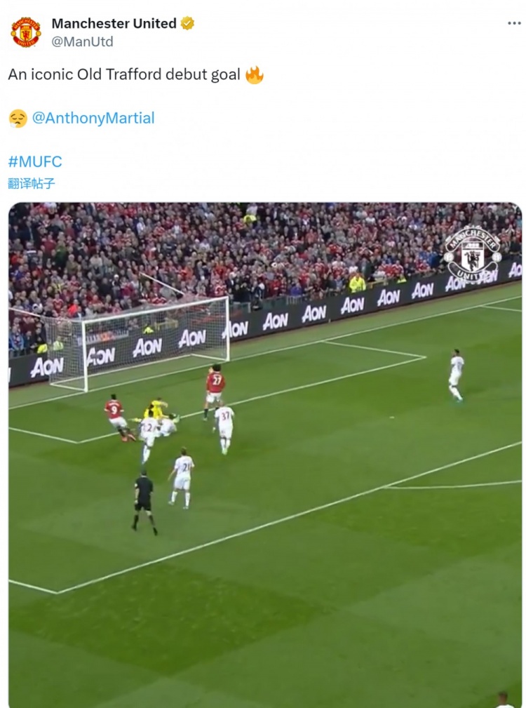 6月24日讯 曼联官方更新社媒动态,晒出马夏尔在曼联的处子进球。