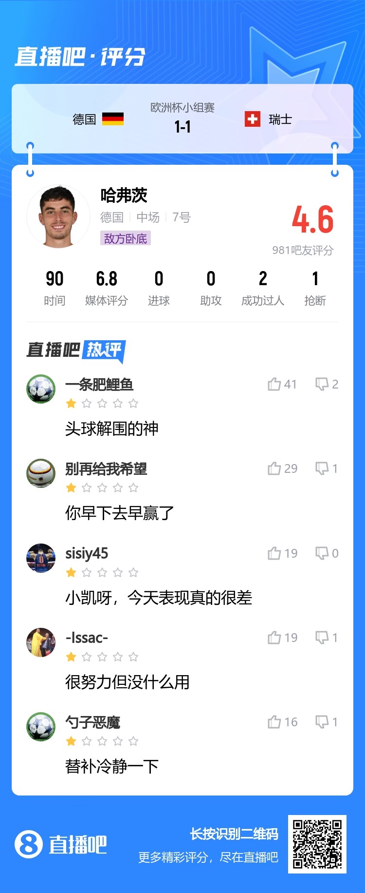 06月24日讯 欧洲杯小组赛最后一轮,德国1-1战平瑞士。哈弗茨出战58分钟被换下,赛后吧友们为他打出4.6分的低分。