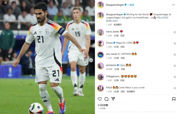6月24日讯 德国在本轮欧洲杯1-1绝平瑞士,德国队长京多安在赛后发文纪念。京多安晒出了自己的比赛照,并配文:“对士气至关重要!我们以小组头名不败出线!挺进16强