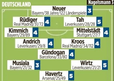 诺伊尔和穆西亚拉是首发中仅有的及格球员,哈弗茨、塔和维尔茨则获得了最差的5分,而吕迪格、基米希、米特尔施泰特、克罗斯、安德里希、京多安均获评4分。