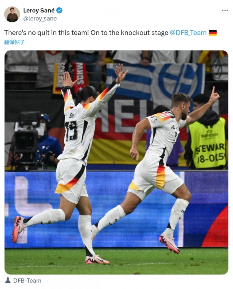 6月24日讯 在北京时间今天凌晨进行的欧洲杯最后一轮小组赛中,德国依靠菲尔克鲁格的绝平进球1-1战平瑞士,以小组头名身份出线。此役替补出场的萨内赛后在社交