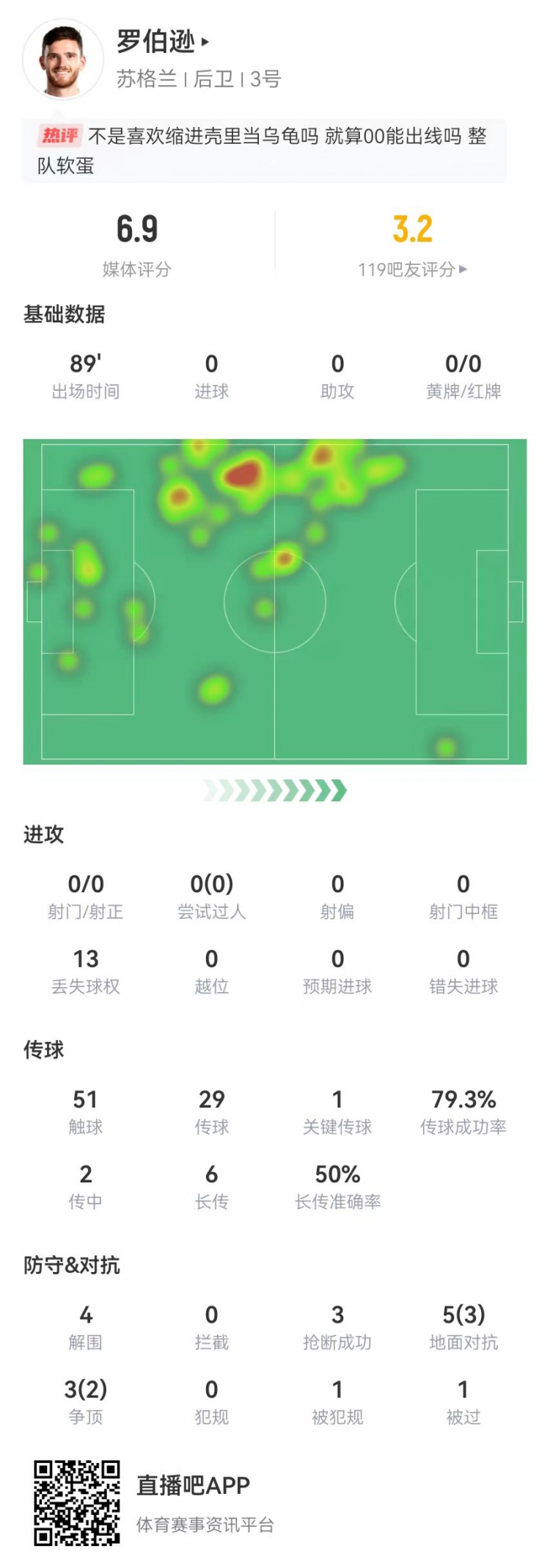 罗伯逊本场数据:1关键传球+4解围3抢断 获评6.9分