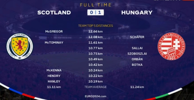 6月24日讯 苏格兰在本轮欧洲杯0-1遭匈牙利绝杀,两队跑动数据如下: