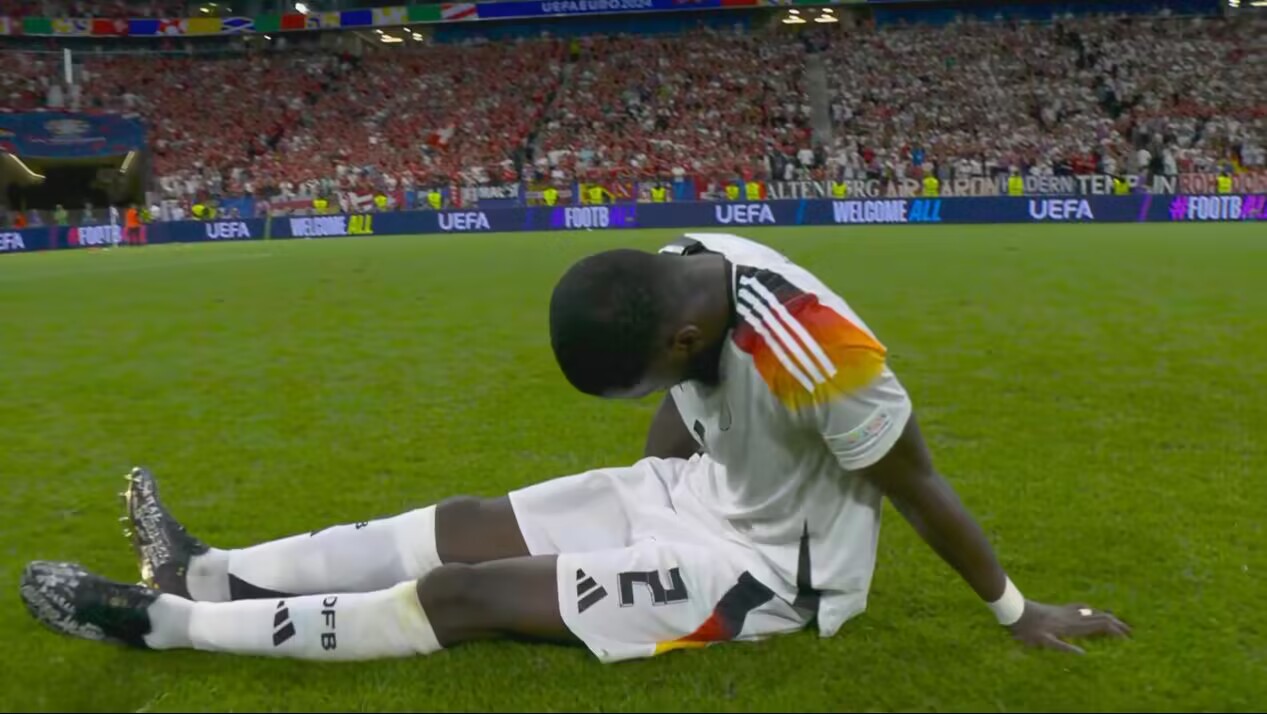 06月24日讯 欧洲杯小组赛A组第3轮,德国1-1绝平瑞士,吕迪格庆祝时抽筋。