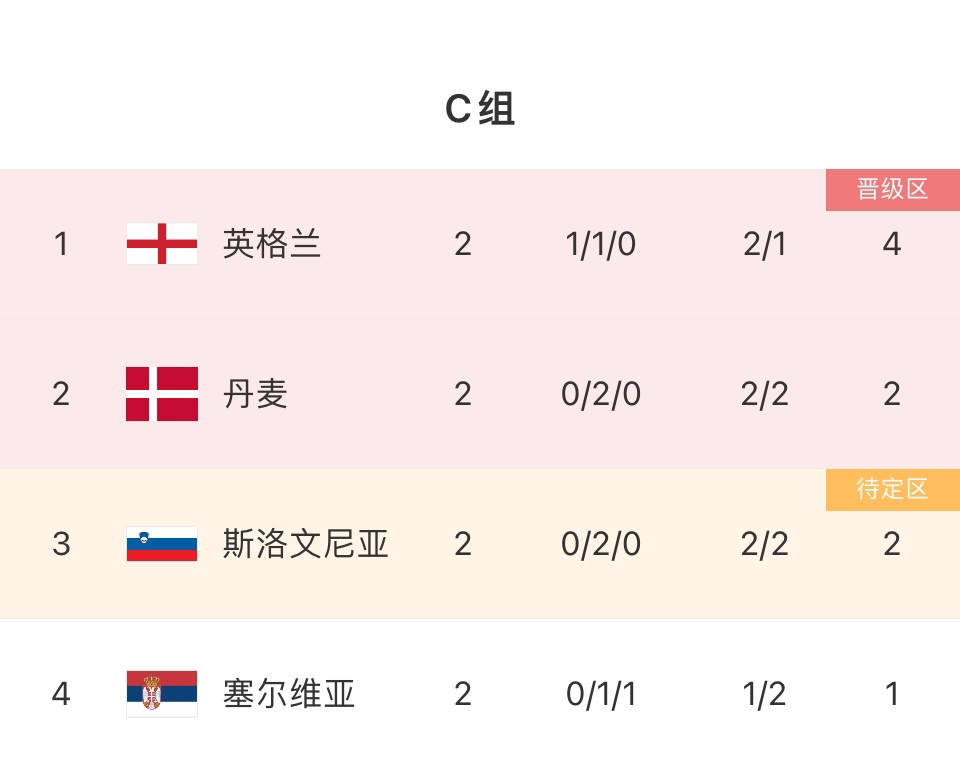 目前C组四支球队:英格兰、丹麦、斯洛文尼亚、塞尔维亚均有可能第二,末轮英格兰vs斯洛文尼亚、丹麦vs塞尔维亚。