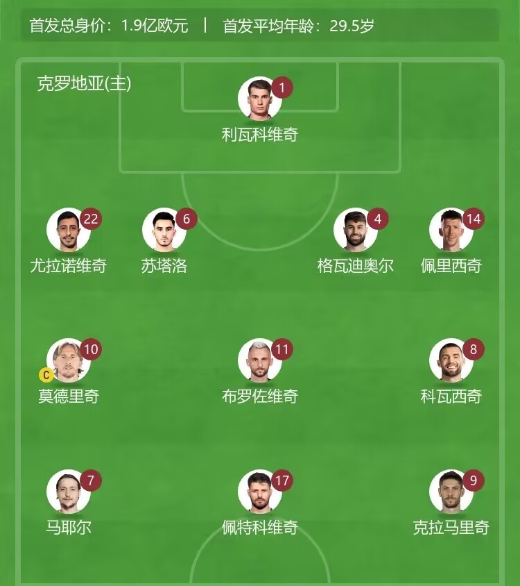 迪马济奥预测克罗地亚的首发(4231阵型):利瓦科维奇、斯坦尼西奇、苏塔洛、庞格拉契奇、格瓦迪奥尔、科瓦西奇、莫德里奇、帕萨利奇、苏西奇、克拉马里奇、布迪米尔。