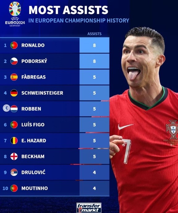 还是他!德转列欧洲杯历史助攻榜:C罗8次并列榜首,6大名将均5次