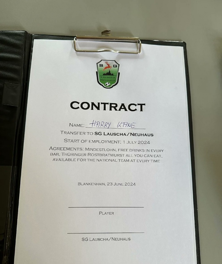 而在本场发布会前,一名当地的德国记者向凯恩送上了本地俱乐部(第7级别联赛)的球衣和合同,并表示:“你喜欢这里的环境,能想象居住在这里吗?我们有一支第7级别联赛的球队,他们向你提供了一份合同。”