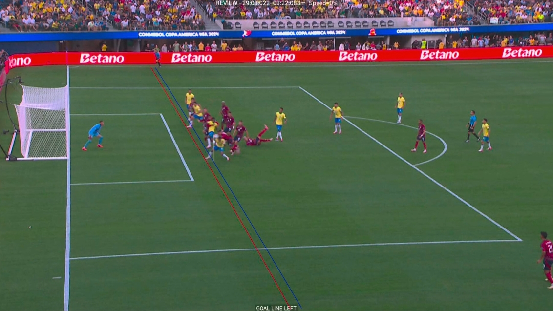 06月25日讯 美洲杯巴西vs哥斯达黎加,拉菲尼亚开出任意球,罗德里戈头球摆渡,马尔基尼奥斯垫射破门,但是随后VAR介入,长时间的确定之后因为进球越位被吹掉,巴西仍0-0哥斯达黎加。