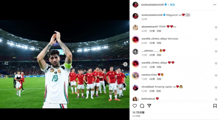 队长索博斯洛伊晒出谢场照片,并简言意骇配文:“匈牙利队!”