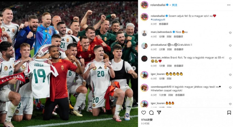 送出助攻的罗兰-绍洛伊则晒出全队和受伤瓦尔加的球衣合照,并表示:“我们永远不会放弃!这就是匈牙利精神!”