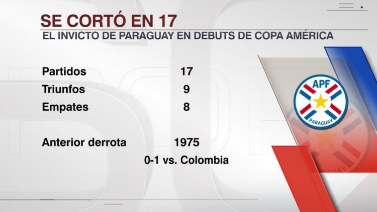 据ESPN统计,1975年之后巴拉圭17场美洲杯首场比赛保持不败(9胜8平),而今天他们的纪录被哥伦比亚终结。