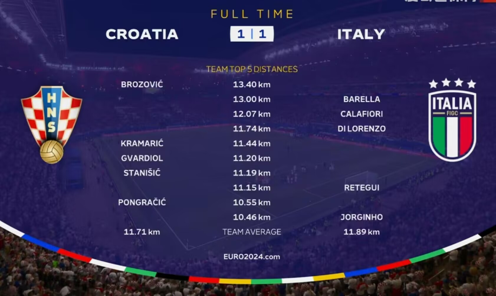 意大利vs克罗地亚跑动数据:布罗佐维奇13.4公里最多,巴雷拉次席