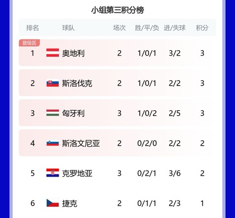 A组第三匈牙利获得3分,D组、E组小组第三也至少3分。克罗地亚2分且净胜球-3,要想出线必须战绩优于C组和F组第三。