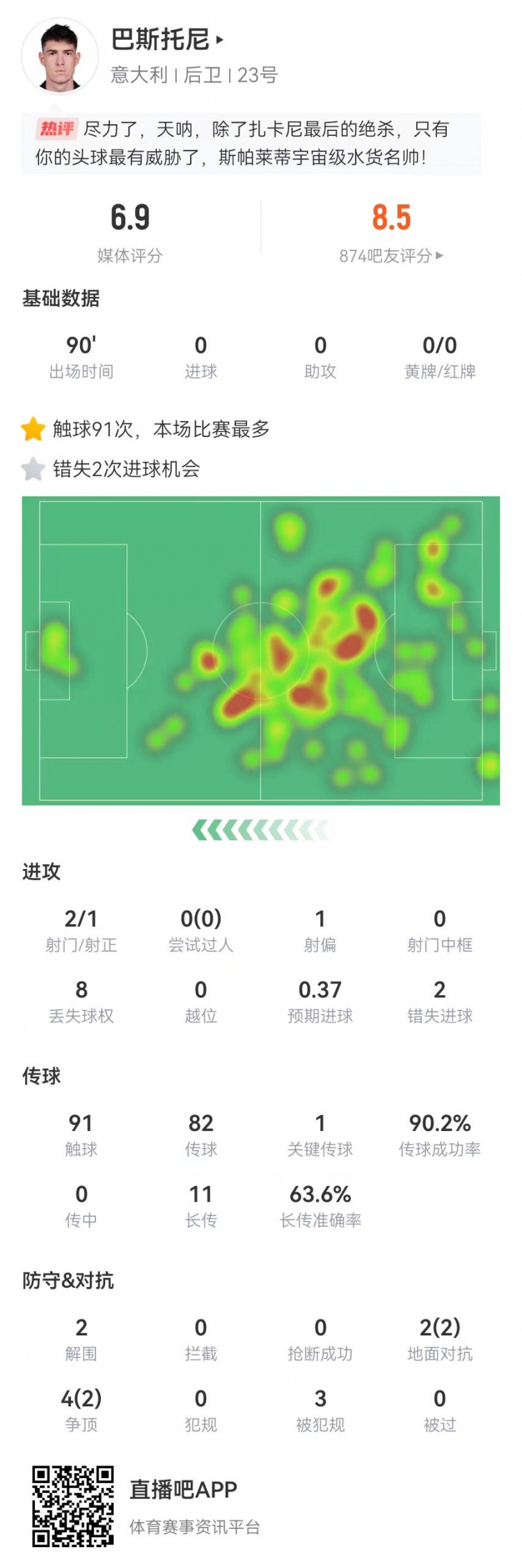 6月25日讯 意大利在本轮欧洲杯1-1绝平克罗地亚,巴斯托尼本场数据如下:出场90分钟防守端仅2解围封堵、拦截、抢断均挂零6次对抗、4次成功8次丢失球权3造犯规9