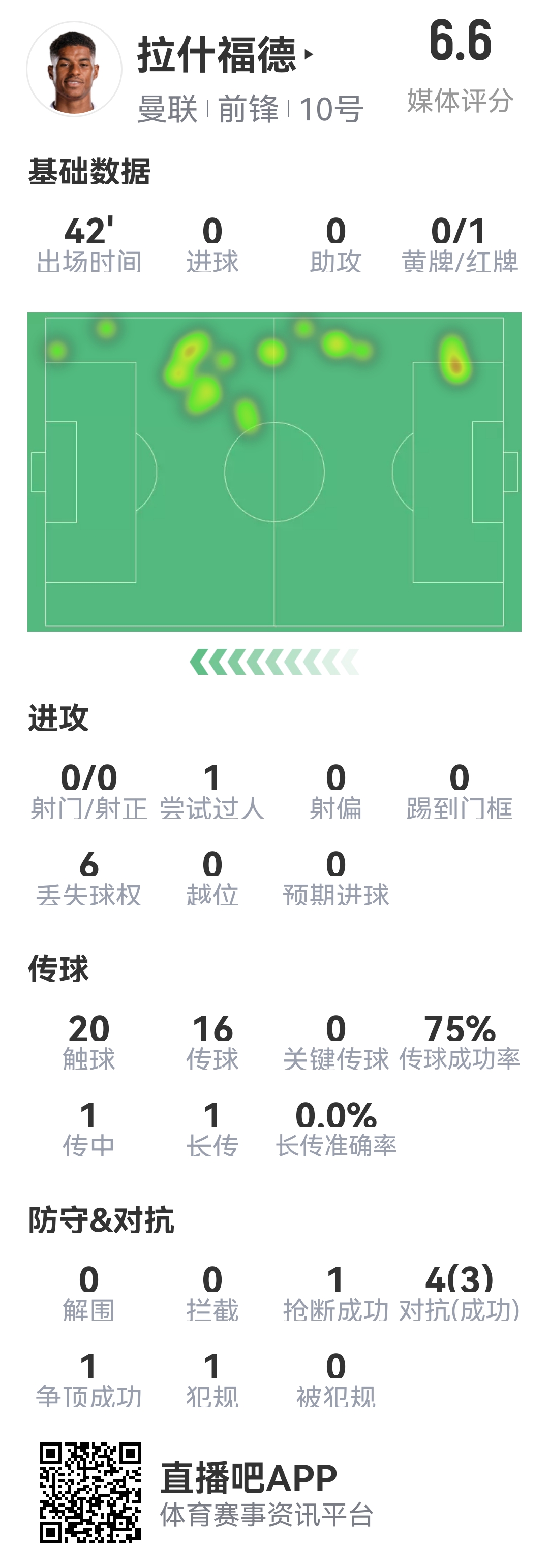 拉什福德数据:出战42分钟,6次丢失球权,4次对抗3次成功,红牌被罚下