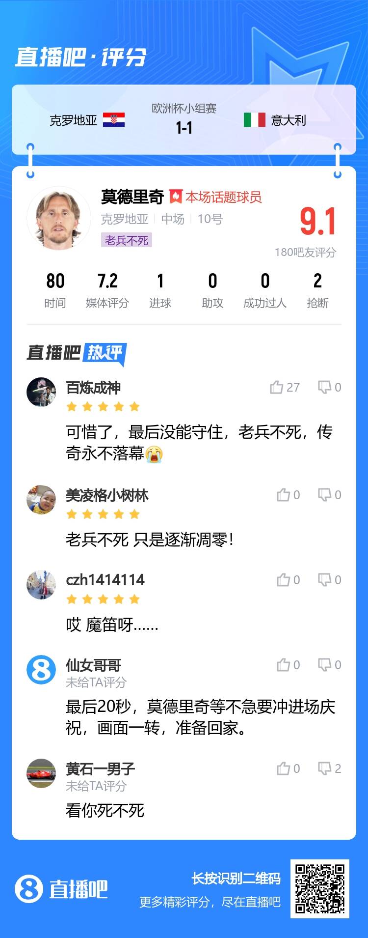 欧洲杯小组赛B组第3轮,意大利1-1绝平克罗地亚。赛后,吧友给老将莫德里奇打出了9.1分的高分。