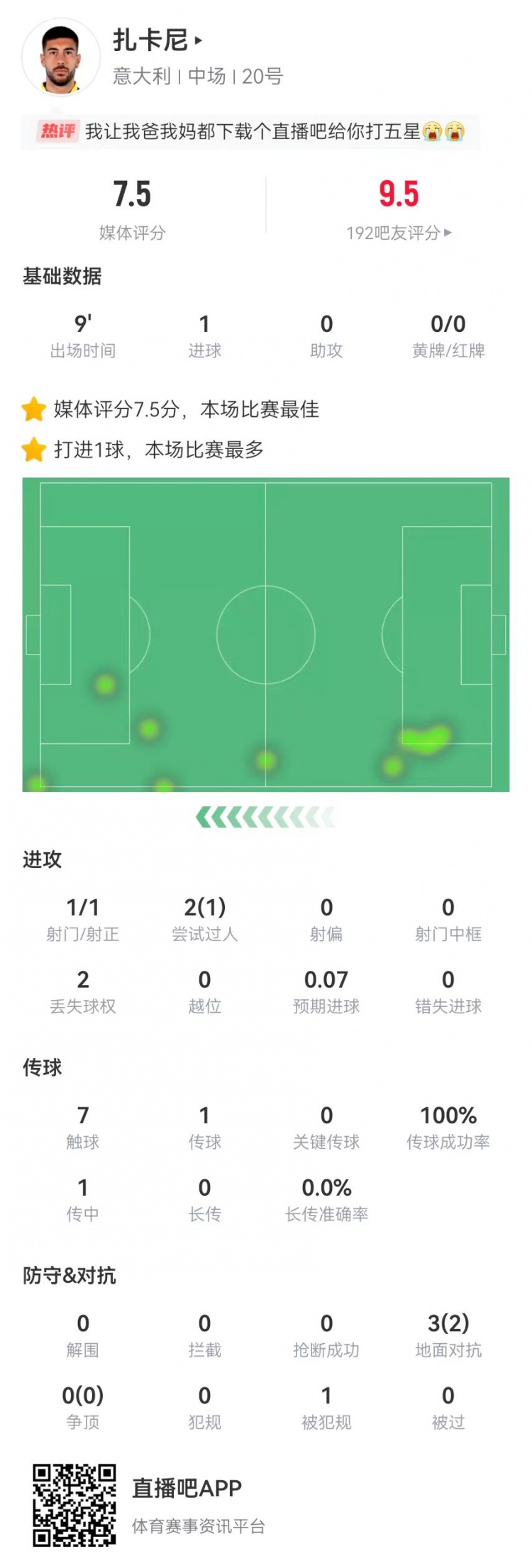 扎卡尼本场数据:1次射门打进绝平 3对抗2成功 获评7.5分