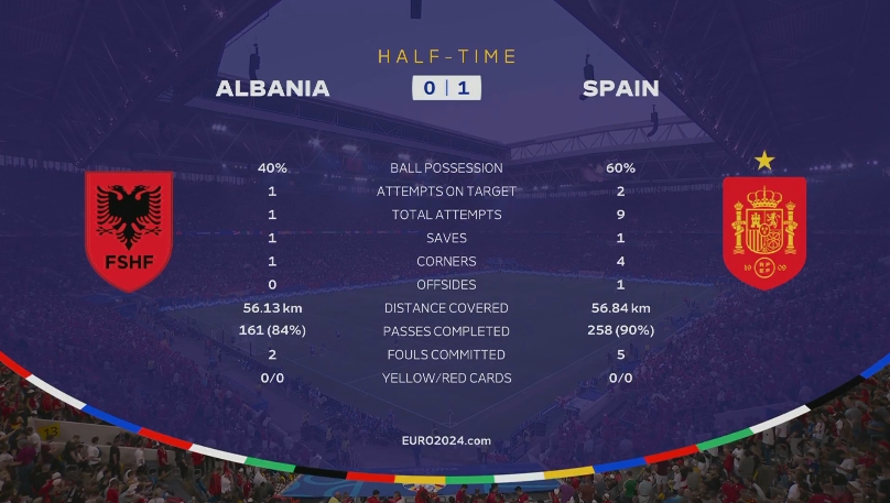 西班牙半场60%控球率掌控局面,9次射门2射正,阿尔巴尼亚半场仅1射门。