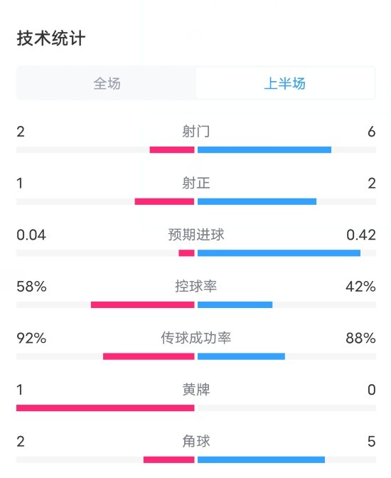 克罗地亚VS意大利半场数据:射门2-6,射正1-2,控球率58%-42%