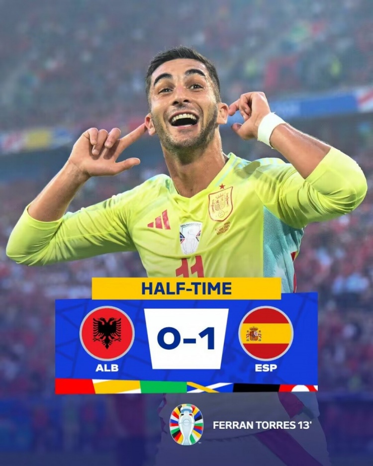 第13分钟,拉波尔特送出斜传,奥尔莫前场右侧得球,随后送出直塞,费兰-托雷斯跟进推射远角得手,西班牙1-0阿尔巴尼亚。↓