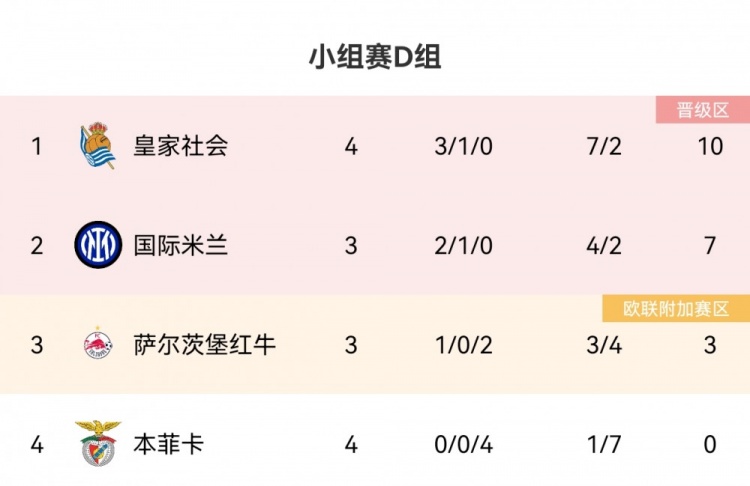 不容小觑!皇家社会欧冠小组赛三连胜登顶,国米后赛暂列第二