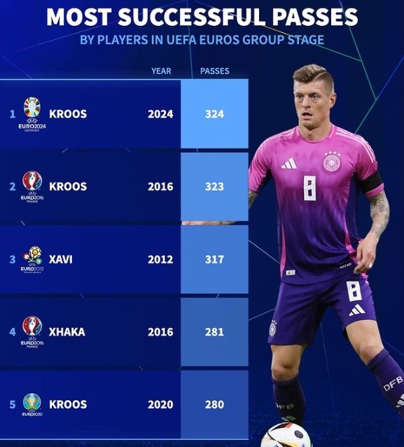 单届欧洲杯小组赛成功传球榜前五:克罗斯占三,哈维扎卡在列