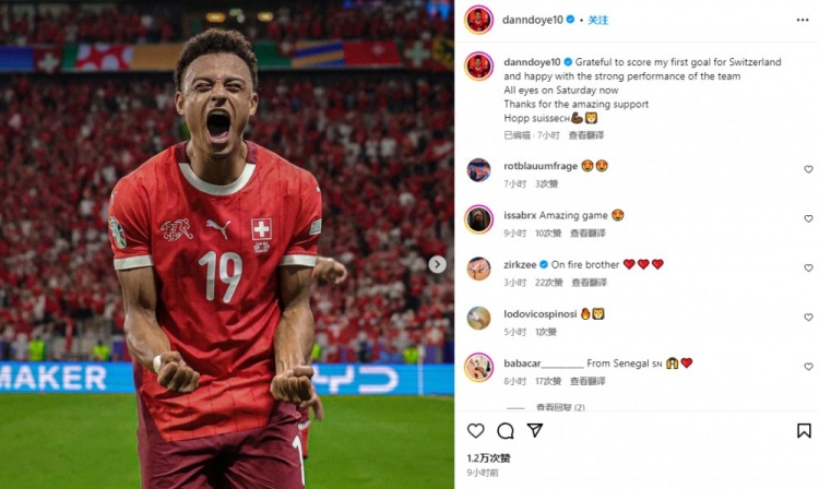 而他也通过社媒晒出庆祝进球的照片纪念国家队处子球:“很感激能够为瑞士队打进个人处子球,也为球队的出色表现感到高兴。”