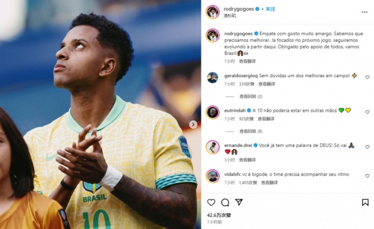 罗德里戈发文称:“平局令人感到十分苦涩。我们清楚巴西队需要提高。我们已经聚焦于下一场比赛,将在本场基础上继续进步。感谢大家的支持,巴西加油!”