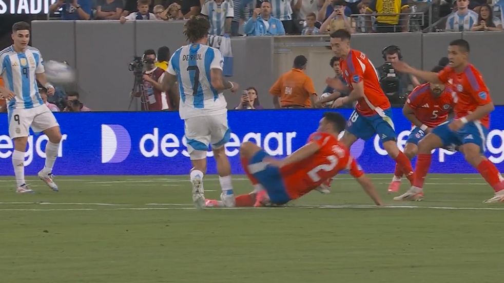 06月26日讯 美洲杯小组赛第二轮,阿根廷vs智利。比赛第27分钟,苏亚佐封堵德保罗射门,后者打门后结结实实踩在苏亚佐小腿上。