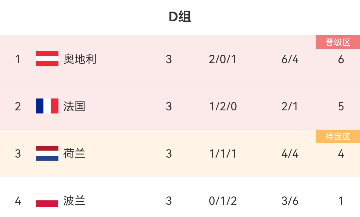 D组最终积分榜:奥地利头名出线,法国第二荷兰第三,波兰垫底