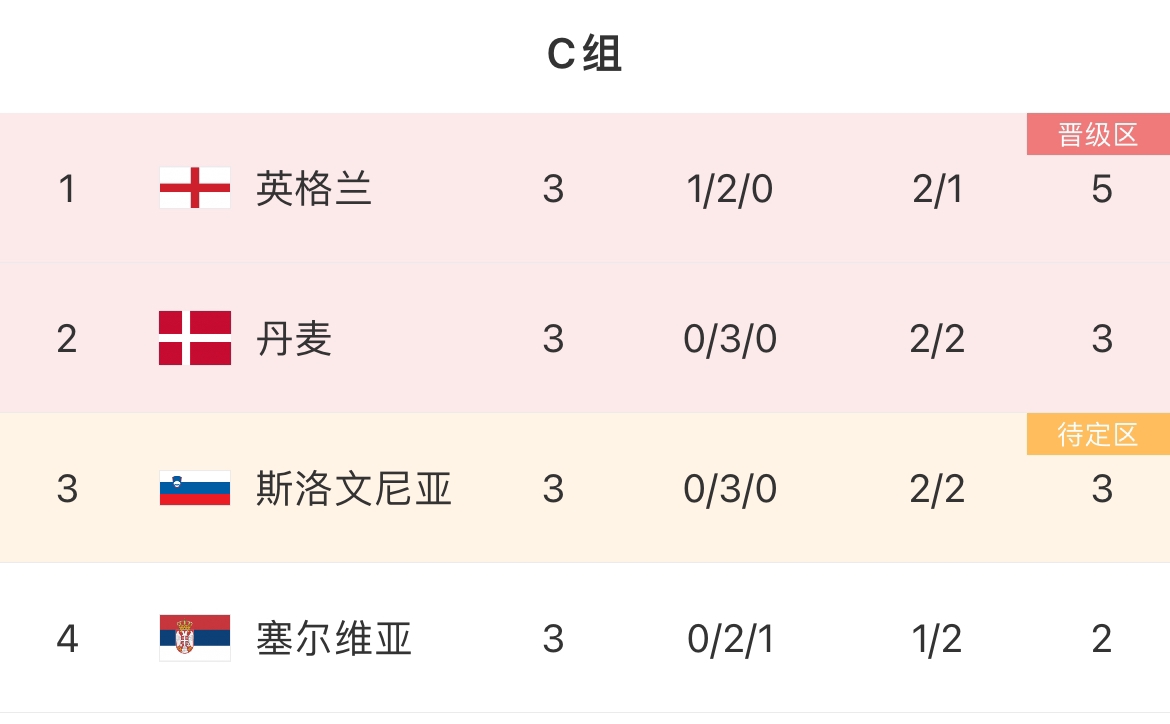 英格兰5分第一出线,丹麦第二将对阵德国,斯洛文尼亚第三晋级,塞尔维亚垫底出局,克罗地亚也确定出局。