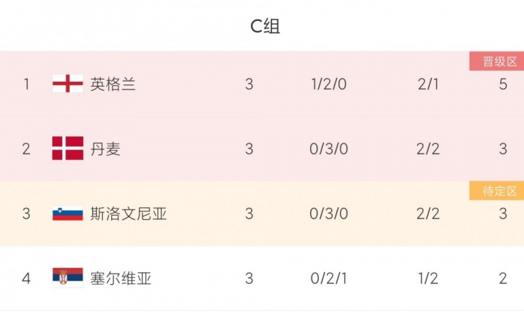英格兰也凭借着仅有的1场胜利,拿到了C组的小组第一!