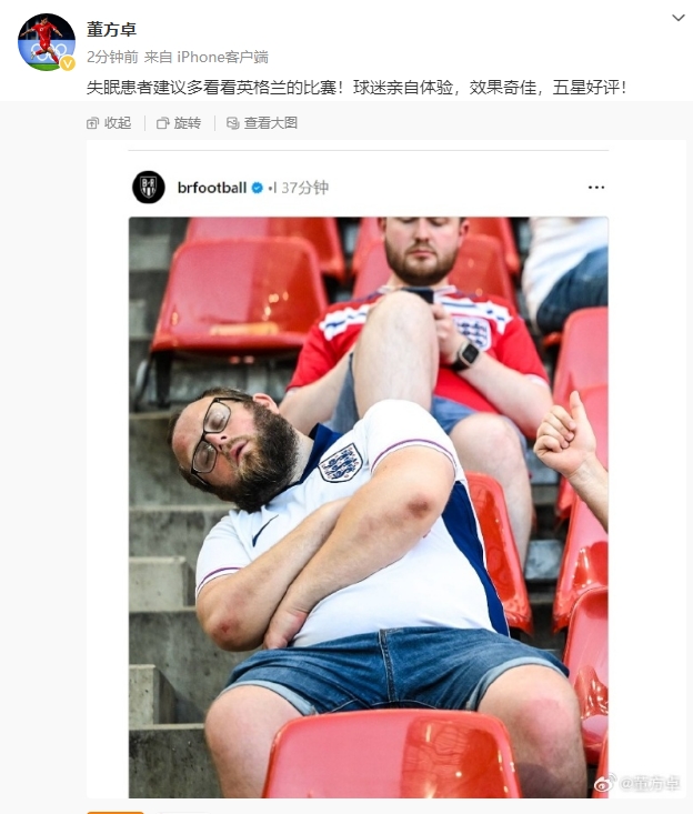 06月26日讯 英格兰0-0战平斯洛文尼亚,两队携手出线。赛后,董方卓晒出球迷睡着的图,并进行了精准吐槽。董方卓:失眠患者建议多看看英格兰的比赛!球迷亲自体验,效