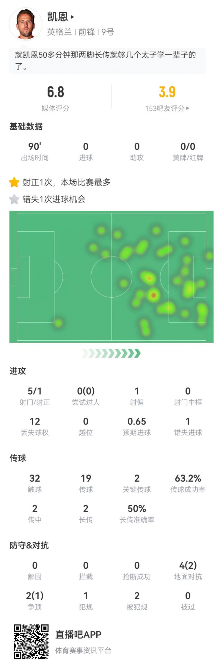 凯恩本场数据:5射1正+1失良机 2关键传球+2造犯规 获评6.8分