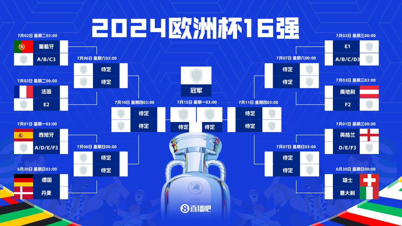 欧洲杯16强阶段,A组第一德国将和C组第二名丹麦交手;英格兰逃离葡法西德“死亡半区”,8强战可能碰上意大利。