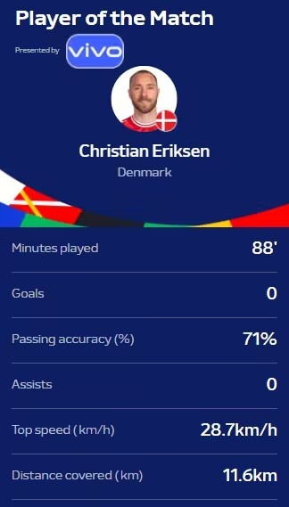 6月26日讯 丹麦在本轮欧洲杯0-0闷平塞尔维亚,曼联中场埃里克森当选本场最佳。32岁的埃里克森本场出战88分钟,传球成功率71%,跑动11.6公里,最高时速28.7公里每