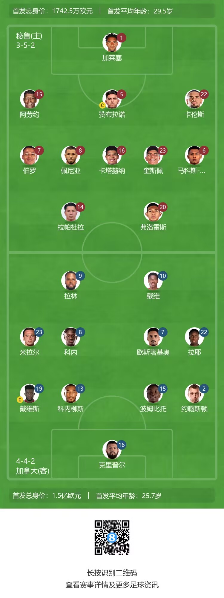 秘鲁首发:1-加莱塞、5-赞布拉诺、6-马科斯-洛佩兹、15-阿劳约、22-卡伦斯、8-佩尼亚、16-卡塔赫纳、23-奎斯佩、7-安迪-伯罗、14-拉帕杜拉、20-弗洛雷斯