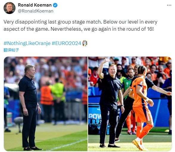 6月26日讯 荷兰在本轮欧洲杯2-3不敌奥地利,主帅科曼在赛后更新了社媒。科曼表示:“对于最后一场小组赛非常失望。本场各方面的表现都低于我们的标准。但无论