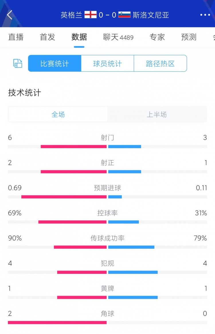 英格兰vs斯洛文尼亚半场数据:控球率七三开 射门6-3 射正2-1