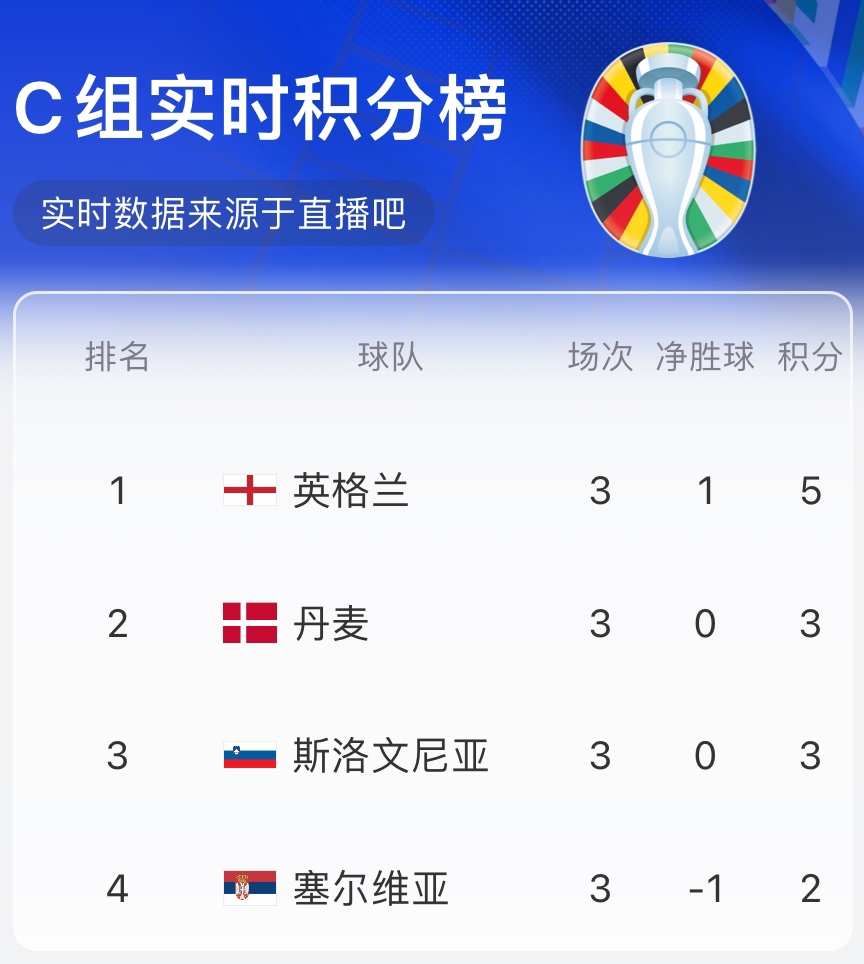 欧洲杯C组实时积分:英格兰5分第一,丹麦、斯洛文尼亚均3分