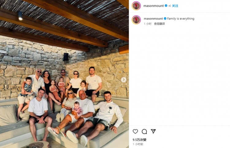 6月26日讯 英格兰正在征战欧洲杯,落选大名单的芒特则在享受假期。他晒出了和家人们的合照,并配文:“家就是一切。”25岁的芒特在去年夏天以6420万欧元从切尔