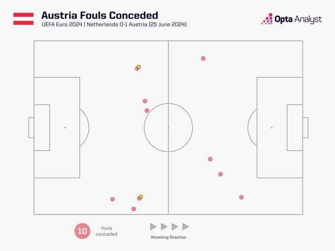 数据统计显示,奥地利单是上半场就完成了10次犯规,在本届欧洲杯单个上半场位列第四。