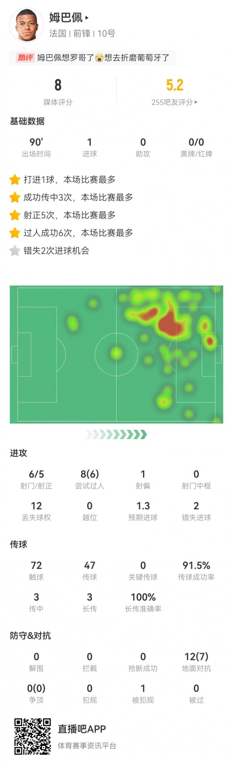 姆巴佩本场数据:1球+2失良机 6射5正 8过人6成功 获评8.0分