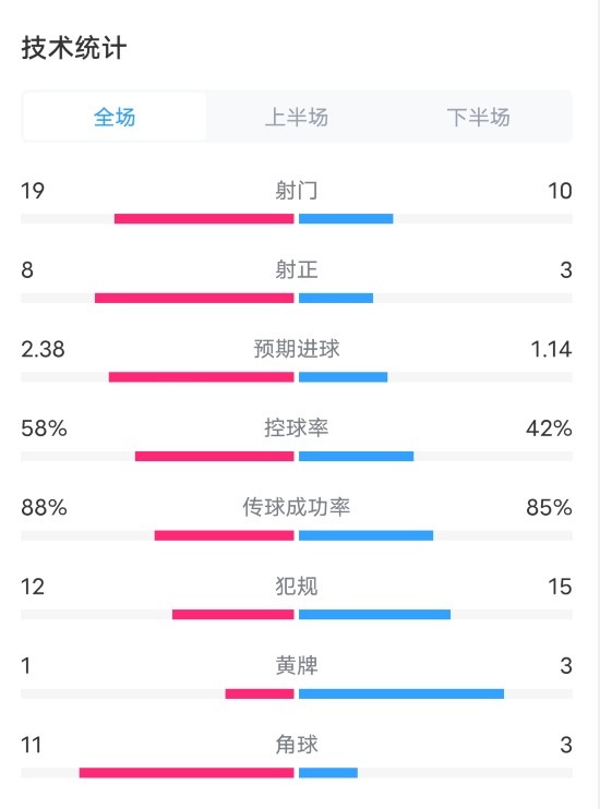 全场比赛数据如下(法国在前):